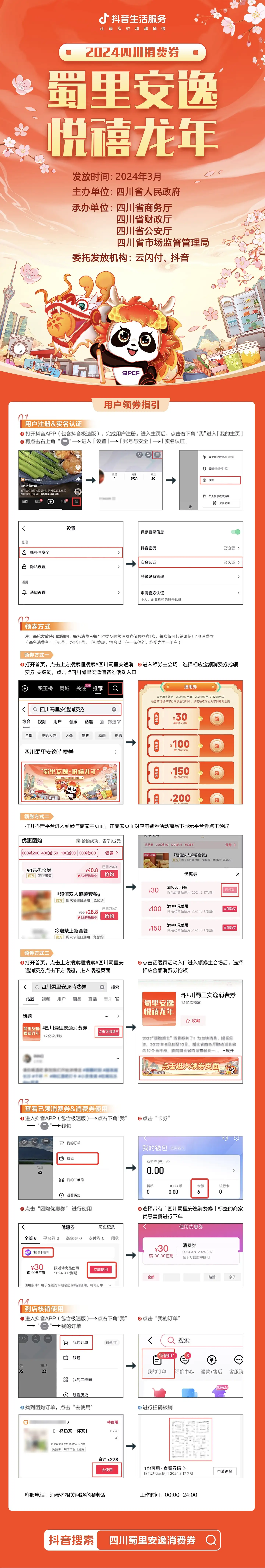 本次消费券发放活动由四川省人民政府主办,四川省商务厅、四川省财政厅、四川省公安厅、四川省市场监督管理局承办。作为线上使用平台的抖音,是本次消费券委托发放机构之一。消费券发放期间,抖音将以内容引领流量全力支持,助力消费券发放与使用,促进消费提升。龙年开好头,优惠福利享不停,来抖音开启喜悦、安逸的春日新生活!